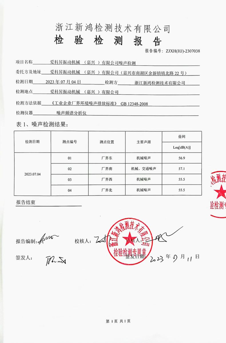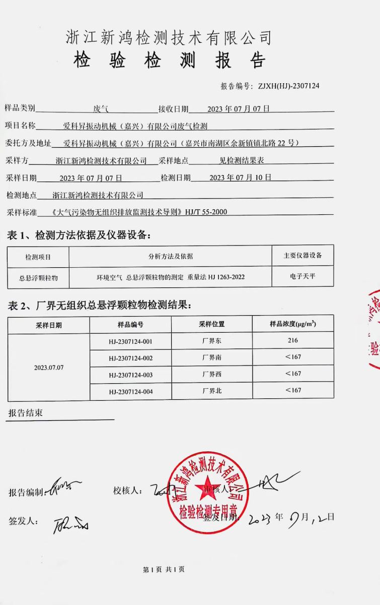 爱科昇振动机械(嘉兴)有限公司于2023年进行的环境污染防治工作,下图是废气检测报告和噪声检测报告。